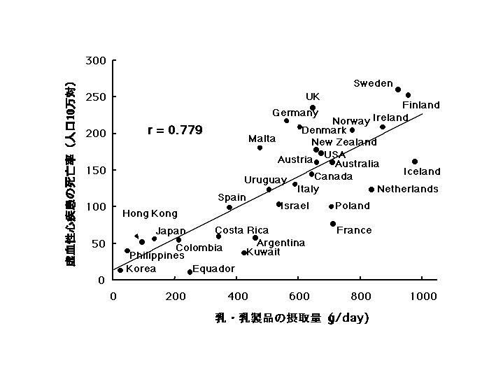 でよいという。60kgの人は36gでよいことになる。日本の第6次栄養所要量(2000年から2004年まで適用)におけるタンパク質所要量は60歳以上の男性でなんと65g、女性で55gである。現在の日本人のタンパク質摂取量は総カロリーの16%にも達している。1998年の国民栄養調査によると、50-59歳の日本人は平均して87.3gのタンパク質を摂取している(うち、動物性タンパク質が46.9gで54%を占める)。日本人の身体が悲鳴をあげている。「タンパク質が多すぎる!」 牛乳を飲まないでカルシウムが充分に摂れるのか。この問いには「象を見よ、象は牛乳を飲んでいますか」と答えよう[15]。アフリカ象の巨大な骨格、2メートルにおよぶ立派な牙。あれはみな草木に含まれるカルシウムから作られたのだ。大地に根を張る植物は土壌のカルシウムを吸収して根や葉に保有する。陸上の巨大な草食動物はみなこのカルシウムによってあのような巨体になった。太陽光の少ない地域の習性だろうか、西洋人は生野菜を好む。料理名はサラダという。困ったことに、最近の若い日本女性も野菜サラダを好む。理由を尋ねると「生野菜は新鮮だから」という。生の植物の葉や茎はウシやヒツジの食べ物であって人間の食べるものではない。植物は生き物だ。植物の葉は、虫に食べられないように、保護膜(自然の農薬)で覆われている[16]。草木のセルロースを利用する草食動物は胃腸内の微生物がその保護膜も含めて分解してくれるのだ。野菜は茹でこぼしたり、油通しして食べるに越したことはない。古来、アジア人(日本人もしかり)は、野菜を茹でたり、油で炒めたり、漬け物にしたりして食べてきた。調理すればかさが減ってたくさん食べられる。野菜中のカルシウムは牛乳のカルシウムと同程度に吸収される[17]。 7. 牛乳・乳製品が心筋梗塞・脳梗塞を招く 哺乳類は生まれたときの体重が3倍になるまで母乳で育つように設計されている。3キロ強で生まれた人間は1年で体重が3倍の10キロ強になる。誕生日を過ぎれば母乳を必要としない。ウシは40キロで生まれ3ヵ月で3倍の120キロに育つ。その後、子ウシは親と同じように草を食って14ヵ月で妊娠可能なまでに育つ。母ウシが子ウシの哺育用に分泌する体液が牛乳である。乳飲み子は速やかに生長するから、乳液は大量のカルシウムを含む(牛乳は1mg/ml)。離乳後の哺乳類には多量のカルシウムを含むミルクは必要ない。ましてや異種動物のミルクは有害でありこそすれ益は全くない。 栄養所要量の第6次改定でカルシウムは1日600mg必要ということになった。この数字はどのように得られたのか。カルシウム所要量の決め方に簡単に触れておく。[尿中排泄量]+[経皮的損失量]+[体内蓄積量]を計算し、これを吸収効率(=[摂取量−糞中排泄量]/[摂取量])で割った数値が必要摂取量ということになる。この計算に必要な尿中排泄量、経皮的損失量、体内蓄積量、吸収効率の基礎的データはすべて欧米人から得られた数値である。たとえば、1日当たりの尿中排泄量は[体重0.75x6mg]というSchaafsma[18]などが提唱する計算式で求めている(体重はkg)。肉や乳製品を大量に食う欧米人は大量のカルシウムを尿中に排泄することは先に述べた。カルシウム動態の異なる欧米人のデータを日本人に当てはめて所要量を決めるなどということはできない。カルシウムの所要摂取量600mgはかなり水増しされた数値である。日本人はすでに1日546mgものカルシウムを摂っている(2002年度国民栄養調査)。60代の日本人はなんと605mgも摂っている。骨粗鬆症の予防のためにカルシウムを摂りましょう(=牛乳を飲みましょう)という宣伝が行き亘ったためだろう。高齢者にヨーグルトを勧めるお医者さんや栄養士がいる。牛乳を飲めない日本人(腹痛や下痢を起こす)でもヨーグルト(発酵乳)は飲めるからだ。昨今の日本人はカルシウムを摂り過ぎる! カルシウムは筋収縮や神経伝達に必須な元素で、その細胞内濃度は厳密に調整されている。多少の余裕はあるが血液中のカルシウム濃度も一定範囲に調整されている。牛乳を介してカルシウムを日常的に大量に摂取すればどうなるか。過剰なカルシウムを尿中に排泄するか他の方法で処理しなければならない。この過程で過剰のカルシウムは尿路結石をつくったり血管壁に沈着したりする。 カルシウムはとくに血管内膜へのコレステロールなどの侵入によって形成される粥状斑(プラーク;この状態が動脈硬化)の周辺部に沈着する。心臓を養う血管(冠動脈)のプラークにカルシウムが沈着するとプラークは剥がれやすくなる。剥がれたプラークは血栓となって移動して冠動脈の内腔の細いところで栓塞を起こす。閉塞部以下の血流を阻害して組織壊死を起こす[19]。これが心筋梗塞である。 世界30ヵ国の牛乳・乳製品の摂取量と虚血性心疾患の死亡率の間には高度の相関関係(r = 0.779)が認められる(図3)[20]。 乳・乳製品を多量に摂取するスェーデン、フィンランド、ノルウェイ、デンマークなどの北欧諸国は虚血性心疾患の死亡率が高