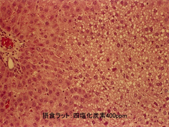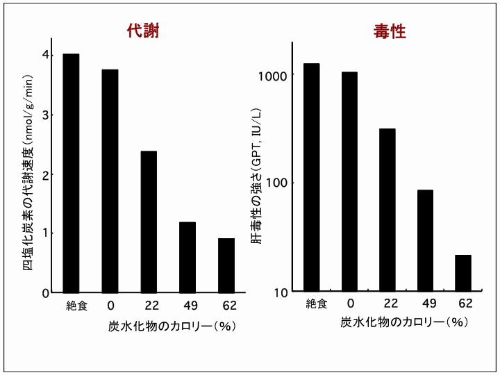 この図の横軸は上の「炭水化物と代謝速度」の図と同じですが、縦軸は肝毒性の指標であるGPTの値を対数で目盛っています(GPTを対数尺で目盛るのは酵素濃度が指数分布するからです。対数変換してはじめて正規分布の代謝速度と比較することができます)。炭水化物の摂取量が少なくなるにつれて肝障害が激しくなり、炭水化物0%の餌を食べたラットの肝臓は絶食ラットの肝臓と同程度の激しい障害を受けました。四塩化炭素の毒性についても、炭水化物を摂らないということは何も食べないことと同じなのです。